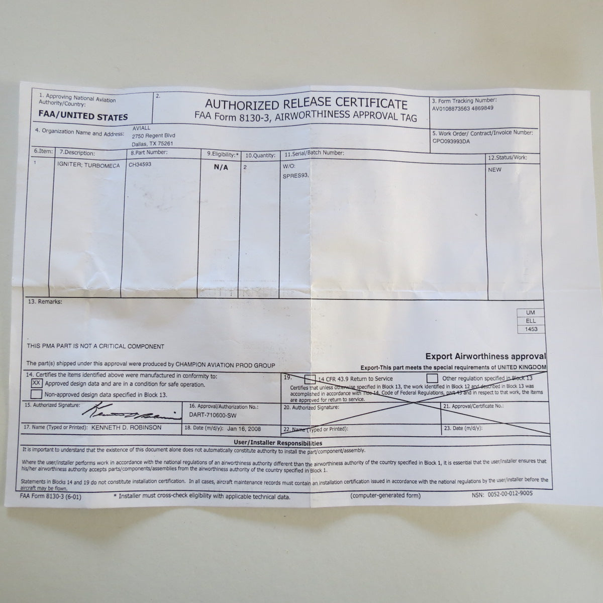 Paperwork : FAA 8130-3